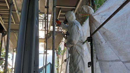 Das Gerüst der Firma Förster aus Schwarzenberg zog neugierig Passanten an – die Gerüst-Einhausung erinnerte ein bisschen an den verhüllten Reichstag in Berlin. Nun gut, nicht ganz so schön, aber für Niederschlema doch aufsehenerregend. Die Einhausung war nötig, denn die Seilscheibe musste mit einer mobilen Sandstrahlanlage bearbeitet werden, bevor der frische Farbanstrich aufgetragen werden konnte. Eine Firma zu finden, die dieses spezielle Verfahren beherrscht, war gar nicht so einfach. Doch mit der Leo Herrmann GmbH aus Hofbieber-Niederbieber im Kreis Fulda fanden die Organisatoren den passenden Partner.