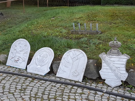 Am Dienstag, den 2.9.2025, ging es dann endlich mit lautem Getöse los: Rost und alte Farbschichten wurden mit einer mobilen Sandstrahlanlage abgetragen, die Seilscheibe wurde grundiert, und in drei Farb- und Schichtaufträgen wurde das Metall wieder vor Wind, Wetter und Korrosion geschützt. Ein Dank an dieser Stelle an die umliegenden Anwohner, die in den drei Tagen durch Lärm und Staub belästigt wurden; sie ertrugen es geduldig und mit Verständnis. Nach drei Tagen war der Spuk auch schon wieder vorbei und das Gerüst wurde wieder abgebaut. Die Wappen wurden durch Malermeister Frank Eubisch aus Niederschlema sorgfältig in mühevoller Handarbeit detailgetreu restauriert, instandgesetzt, was viel Zeit verlangte, und am 10.10.2025 wieder in die Halterungen eingefügt. Auch die Wismut GmbH unterstützte tatkräftig und stellte ein leistungsfähiges Stromaggregat bereit. Die Firma Fritz Beyer-Container-Dienst GmbH aus Aue-Bad Schlema übernahm die Entsorgung des Strahlguts und der Bauabfälle.