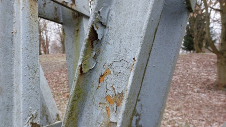 Am Dienstag, den 2.9.2025, ging es dann endlich mit lautem Getöse los: Rost und alte Farbschichten wurden mit einer mobilen Sandstrahlanlage abgetragen, die Seilscheibe wurde grundiert, und in drei Farb- und Schichtaufträgen wurde das Metall wieder vor Wind, Wetter und Korrosion geschützt. Ein Dank an dieser Stelle an die umliegenden Anwohner, die in den drei Tagen durch Lärm und Staub belästigt wurden; sie ertrugen es geduldig und mit Verständnis. Nach drei Tagen war der Spuk auch schon wieder vorbei und das Gerüst wurde wieder abgebaut. Die Wappen wurden durch Malermeister Frank Eubisch aus Niederschlema sorgfältig in mühevoller Handarbeit detailgetreu restauriert, instandgesetzt, was viel Zeit verlangte, und am 10.10.2025 wieder in die Halterungen eingefügt. Auch die Wismut GmbH unterstützte tatkräftig und stellte ein leistungsfähiges Stromaggregat bereit. Die Firma Fritz Beyer-Container-Dienst GmbH aus Aue-Bad Schlema übernahm die Entsorgung des Strahlguts und der Bauabfälle.